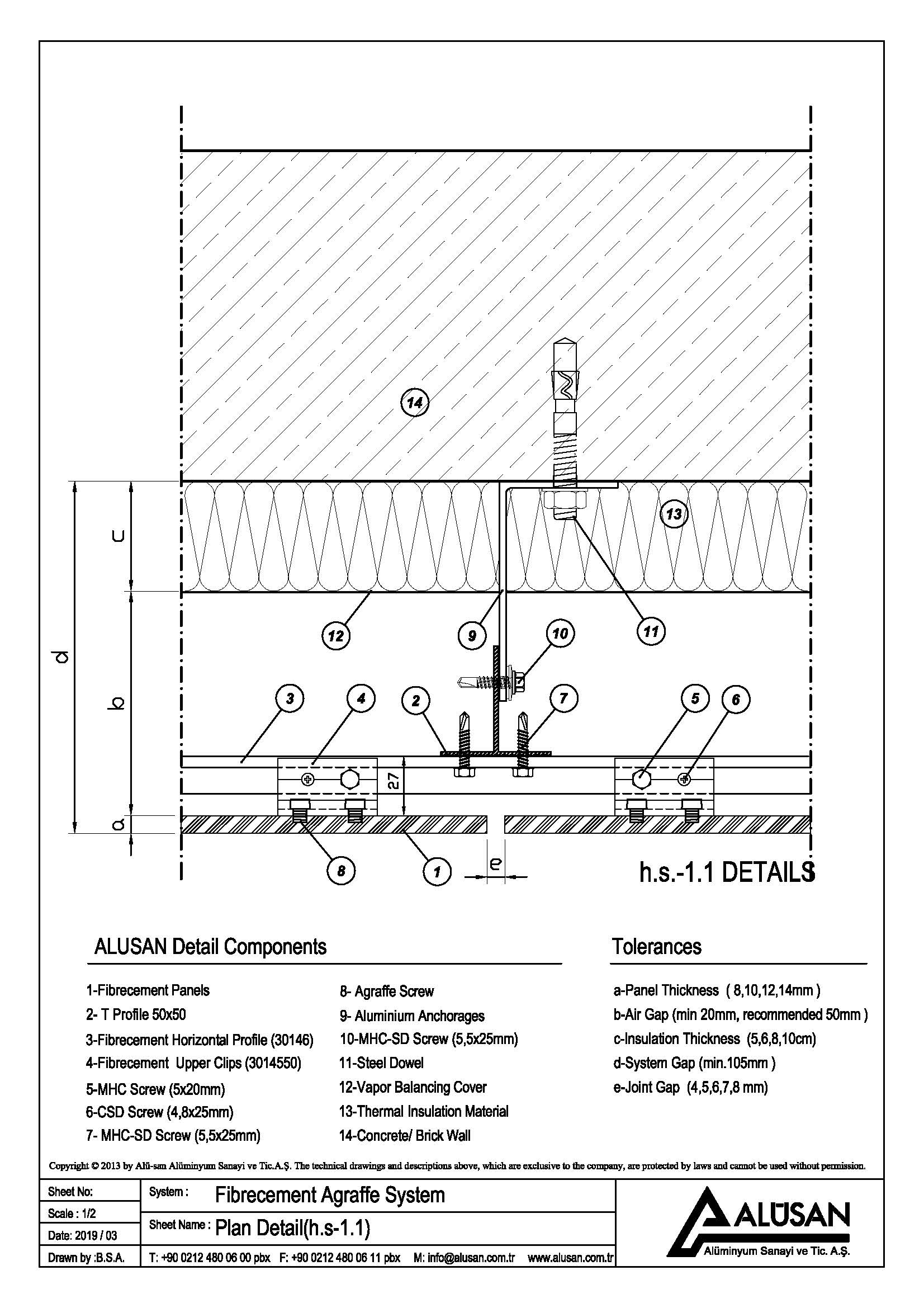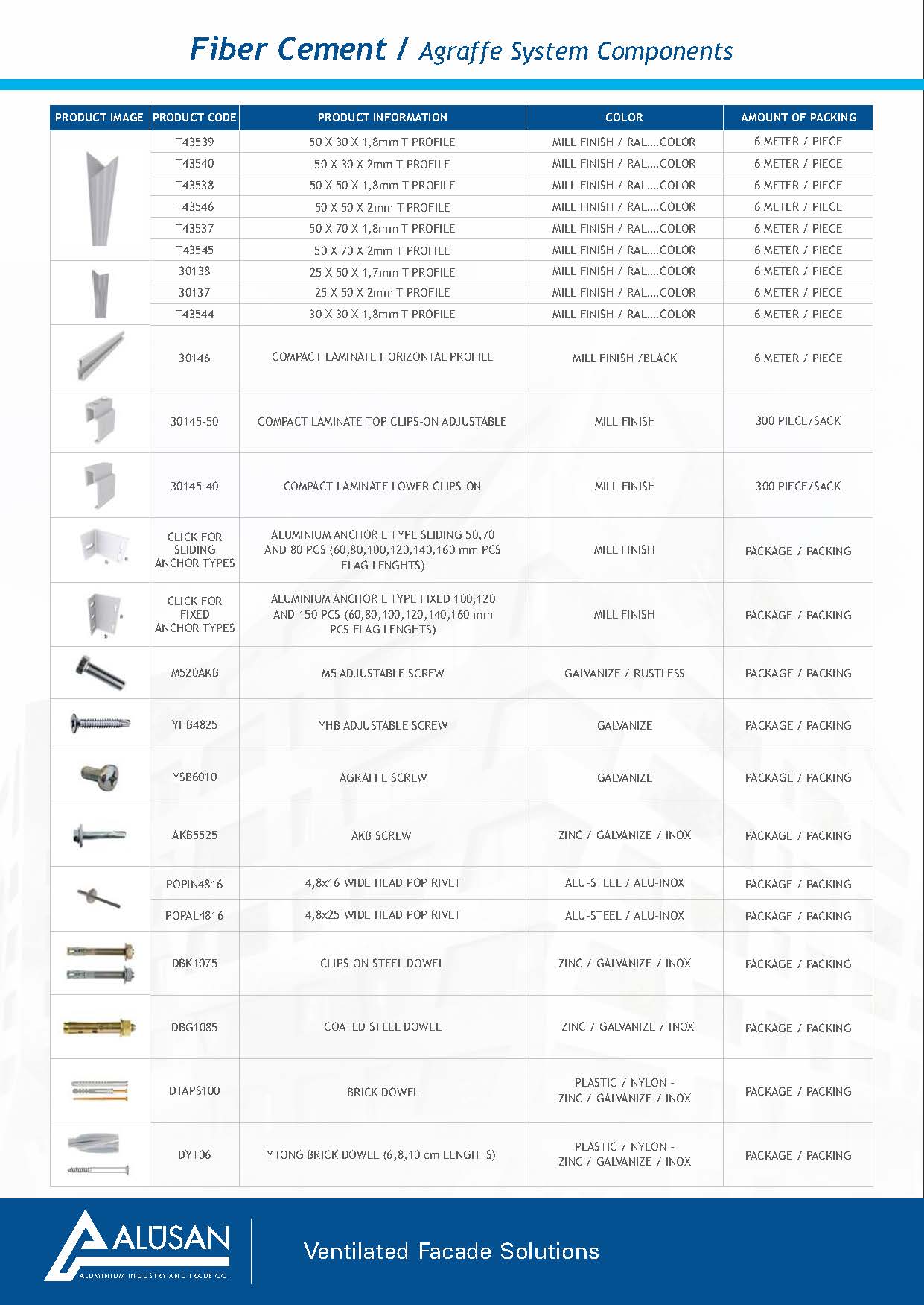 It is hanged on the building facade as per related Project on the load-bearing base construction composed of aluminum anchorages and aluminum vertical T profiles using Fibercement plates and agraffe clips fixed at 4 points on the rear sides. Joints are open in this system.