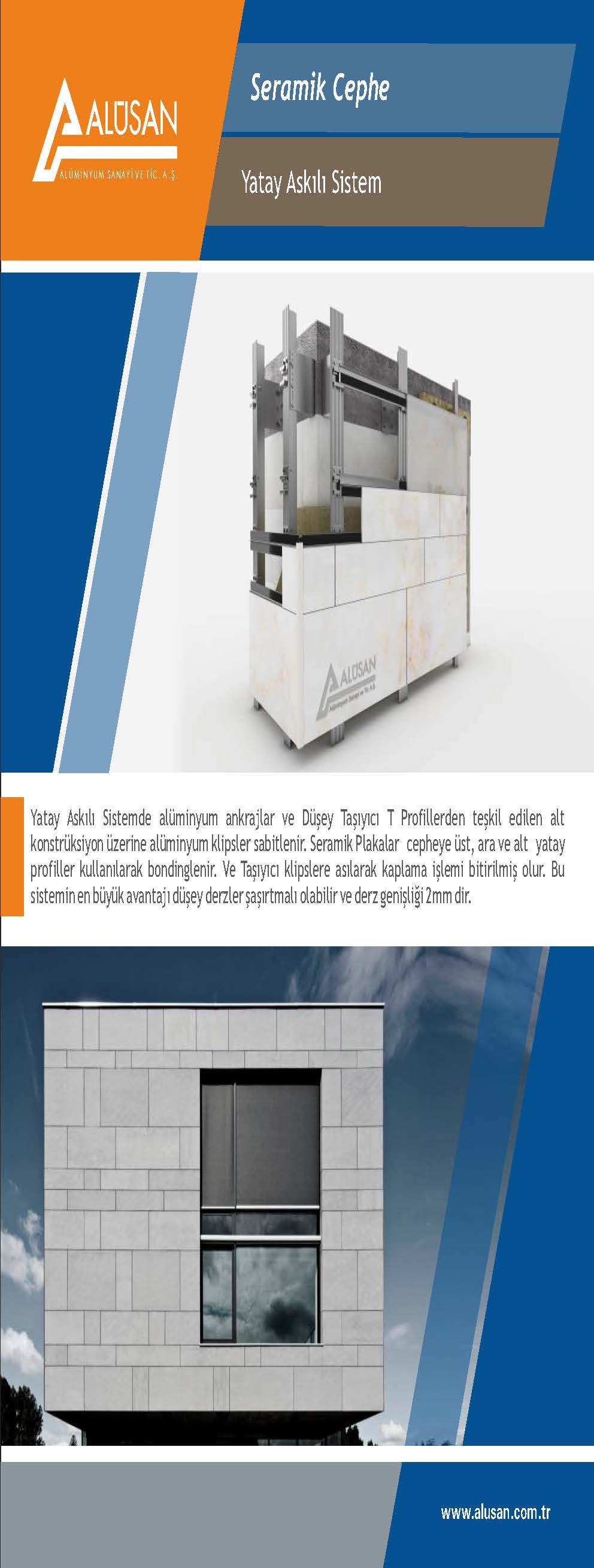 Yatay Askılı Sistemde alüminyum ankrajlar ve Düşey Taşıyıcı T Profillerden teşkil edilen alt konstrüksiyon üzerine alüminyum klipsler sabitlenir. Seramik Plakalar cepheye üst, ara ve alt yatay profiller kullanılarak bondinglenir. Ve Taşıyıcı klipslere asılarak kaplama işlemi bitirilmiş olur. Bu sistemin en büyük avantajı düşey derzler şaşırtmalı olabilir ve derz genişliği 2mm dir.